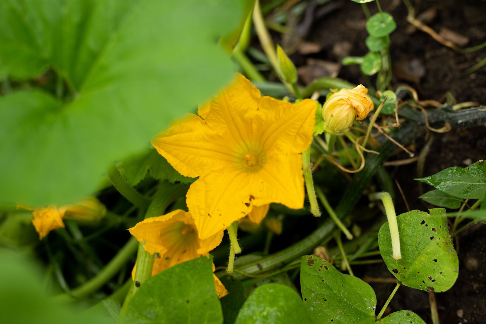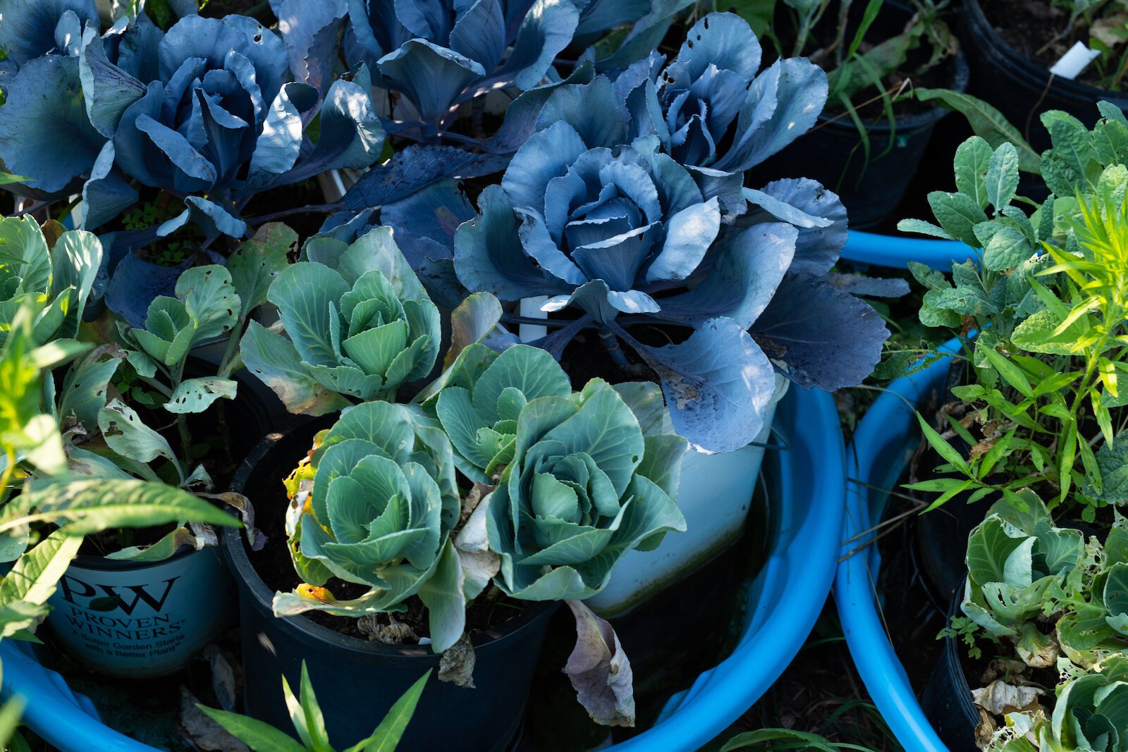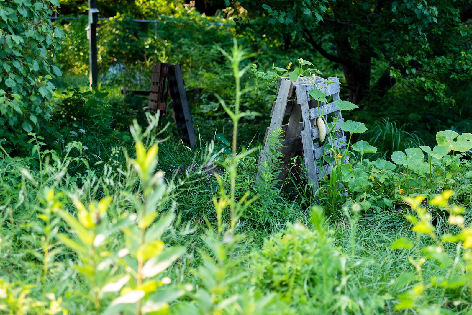 Dotting her property are bright blue baby pools where she grows cabbage and kale in buckets from the local community-scale composting service Dirt Wain. The floating buckets help with water retention, Hart says. Nearby, she succession-plants beets and tomatoes in square cinder block raised beds, and her squash mounds are strewn about flowers and tall grasses with wood palette trellises.
