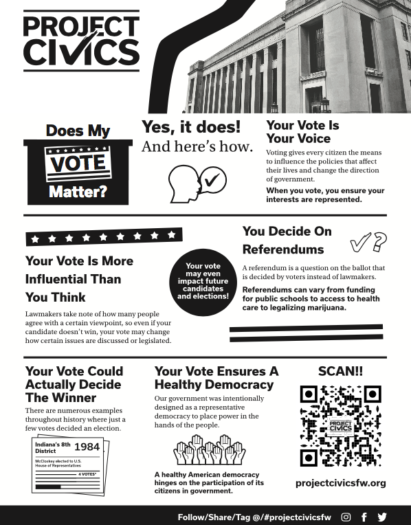 BK: People should stay tuned to our social media pages the next three to four weeks for important information and updates leading up to the election. Find us at @projectcivicsfw on Facebook, Instagram, and Twitter.
