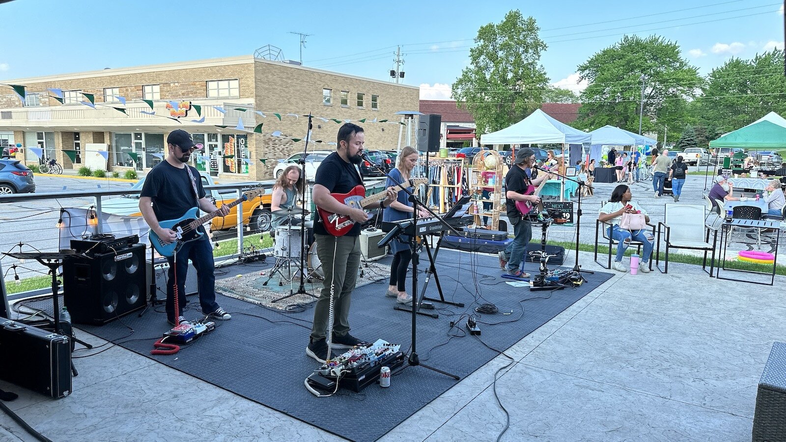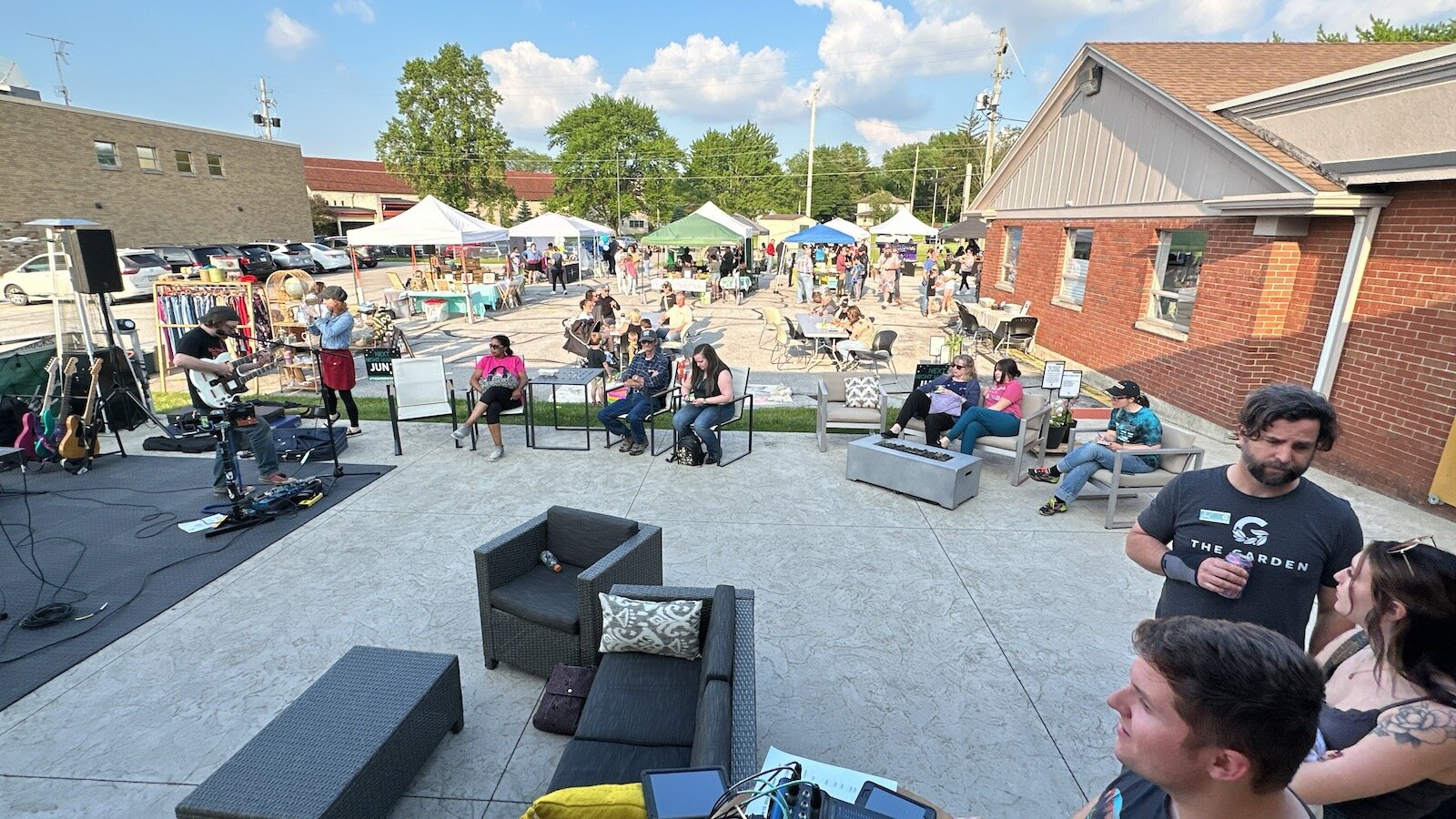We have artisan vendors out in the parking lot who are all Indiana and Midwest homegrown makers. We invite local food trucks. Inside our gallery, we have an art show opening. Scattered throughout our property we also have some kids’ activities like games, sidewalk chalk and more.  It’s a beautiful way to linger under the stars with food and drink in hand while shopping and enjoying great music with friends.