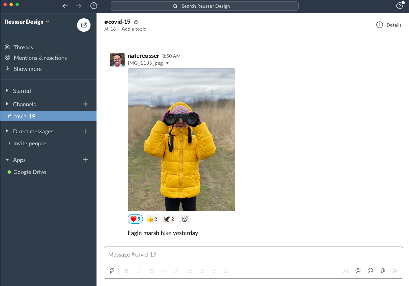 As soon as the decision was made to have the team work from home, we spun up a new Slack channel as a way to share projects, stories, and fun memories while working at home. The response has been great, and it has been a really fun way to keep the team “together” during this time.