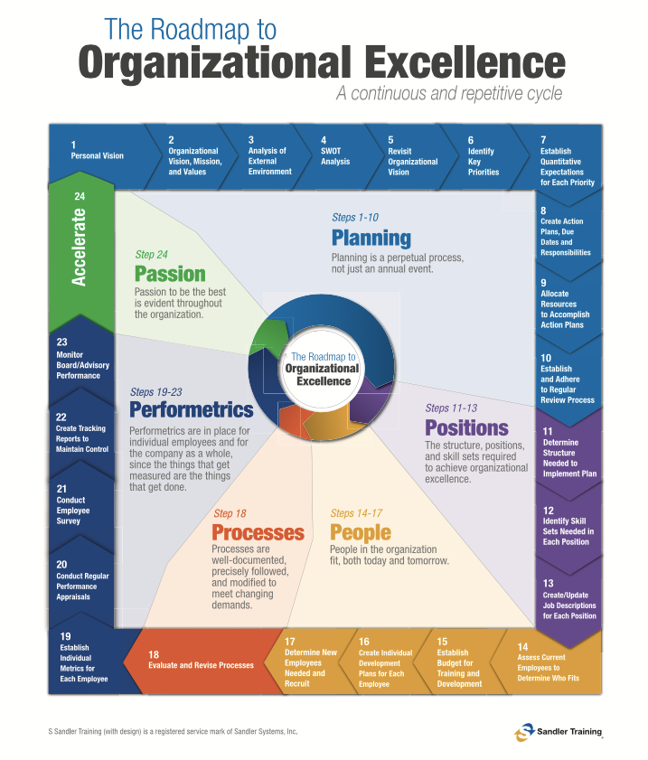 If you can’t comfortably answer “yes” to either of these questions, then you should have a framework for “blueprinting” your business. At the Sandler Performance Center, we call achieving this blueprint: “Organizational Excellence.”