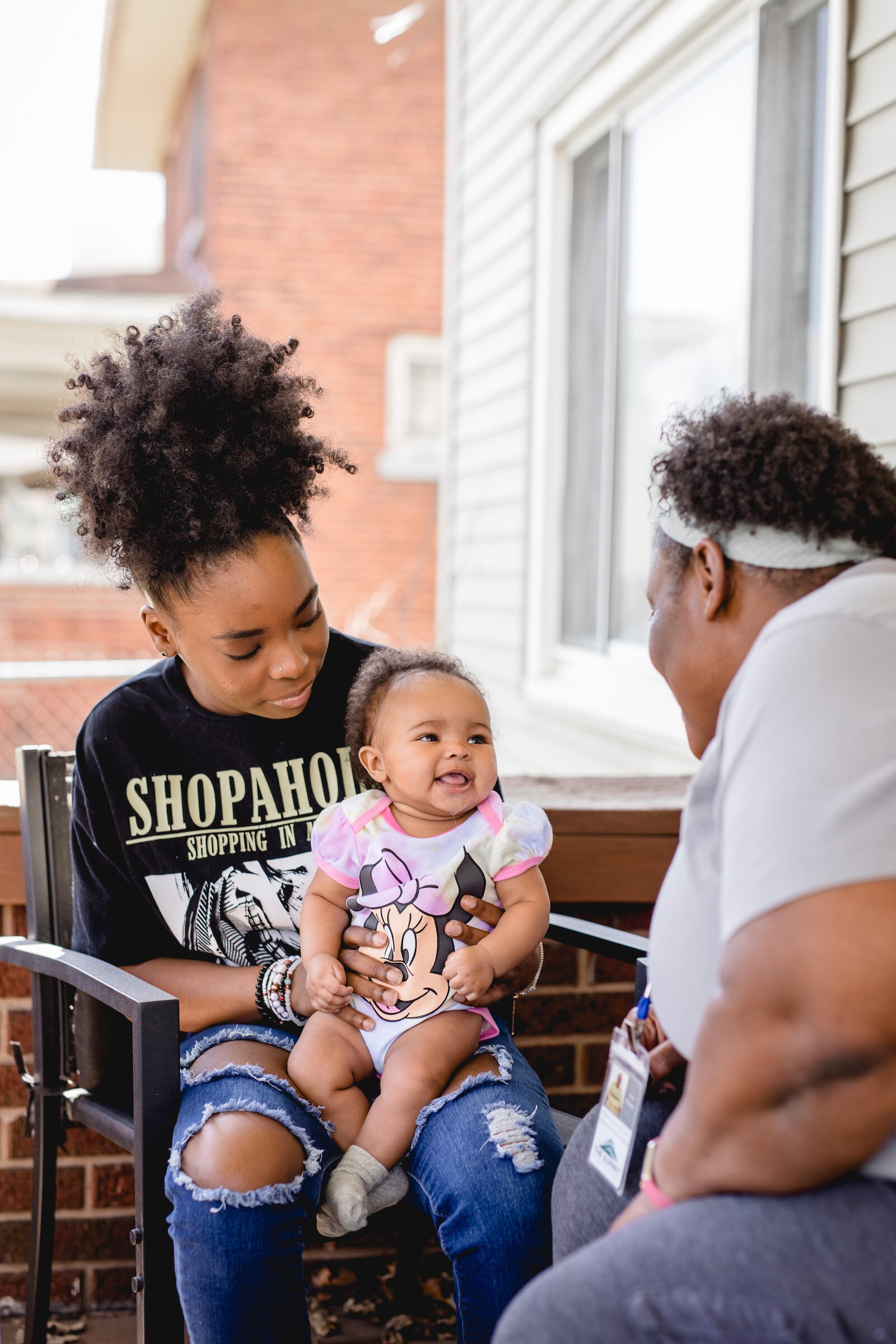 Home visits are a key part of Healthier Moms and Babies' programs. Here a home visitor chats with a mom and her baby.