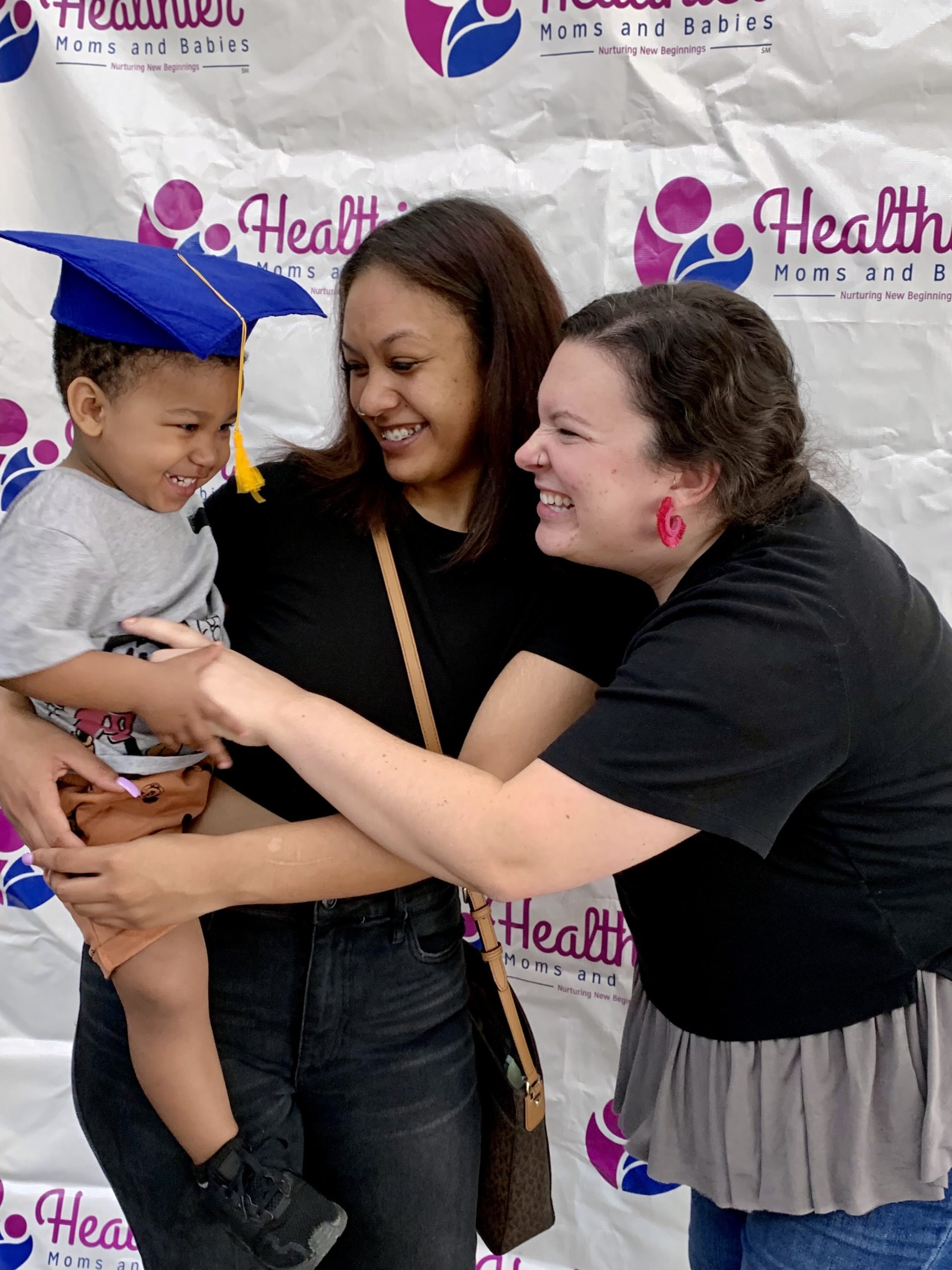Pictures with their home visit nurse, this mom and baby graduate from the Nurse Family Partnership Program at Healthier Moms and Babies.