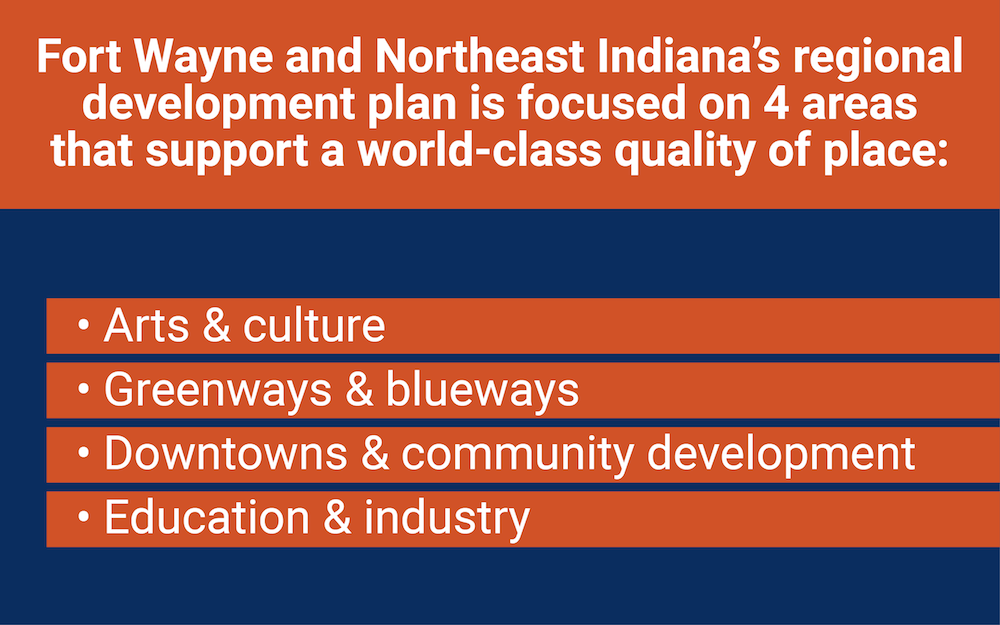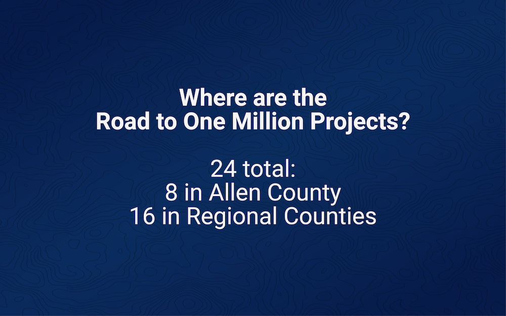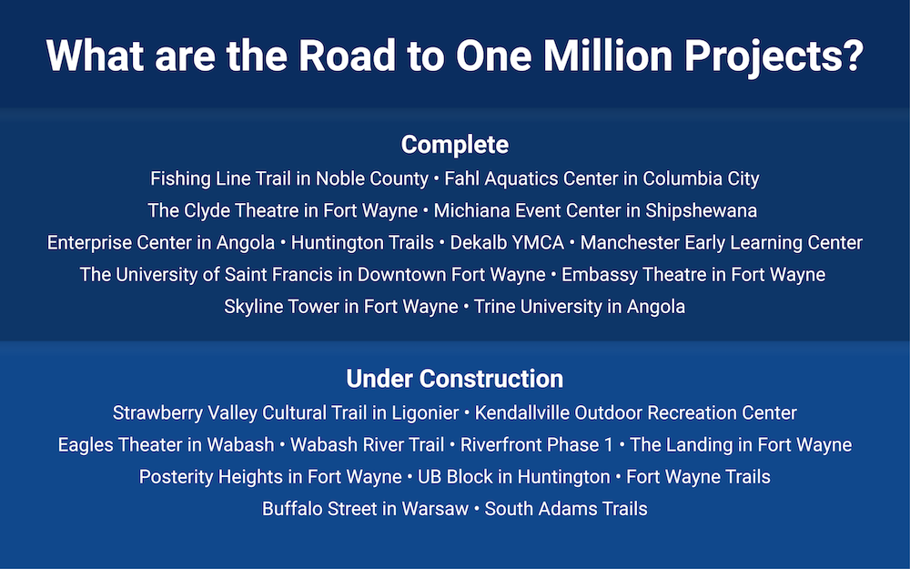 But the timing of these projects is more than serendipity. Many of them are the result of an initiative called the Road to One Million, a regional development plan aimed at funding and promoting key projects throughout the 11-county region. Its goal is to increase northeast Indiana’s population from an estimated 789,015 residents to 1 million residents, ideally by the year 2031.