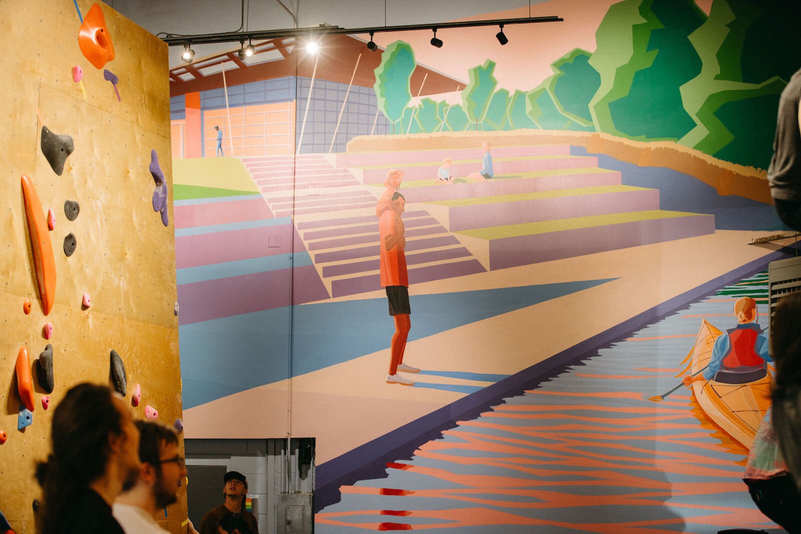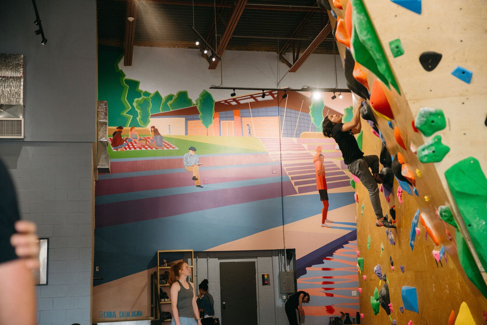 The mural by Chris Catalonga inside Summit City Climbing Co. depicts Promenade Park.