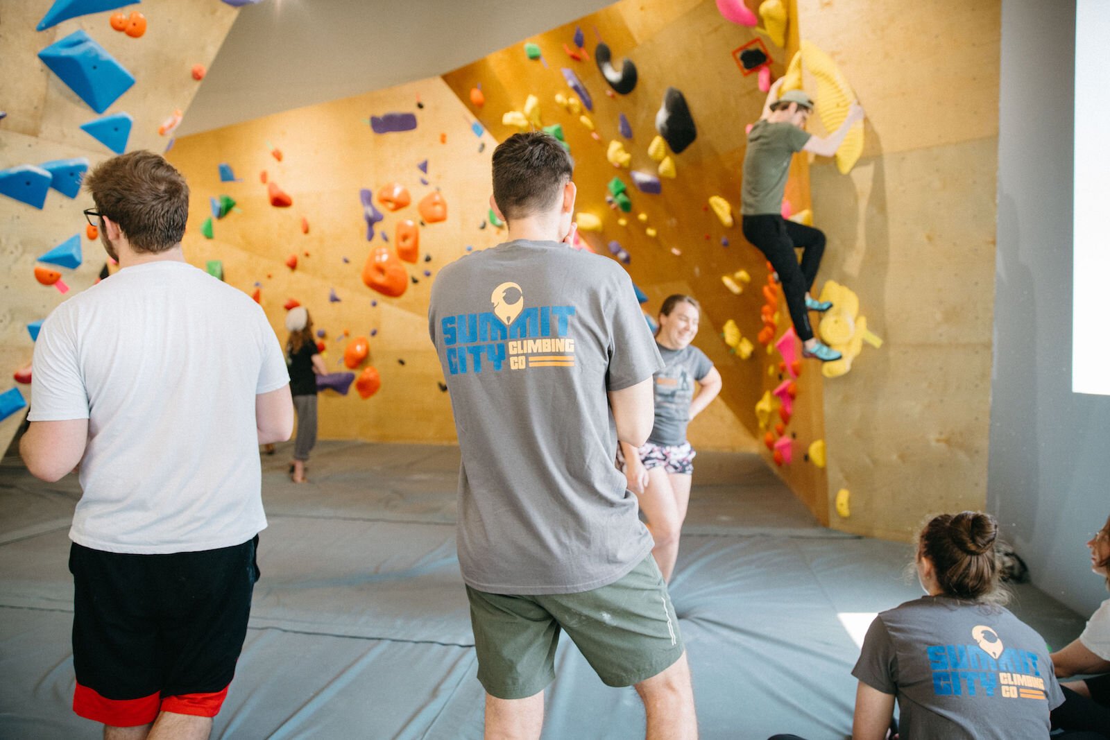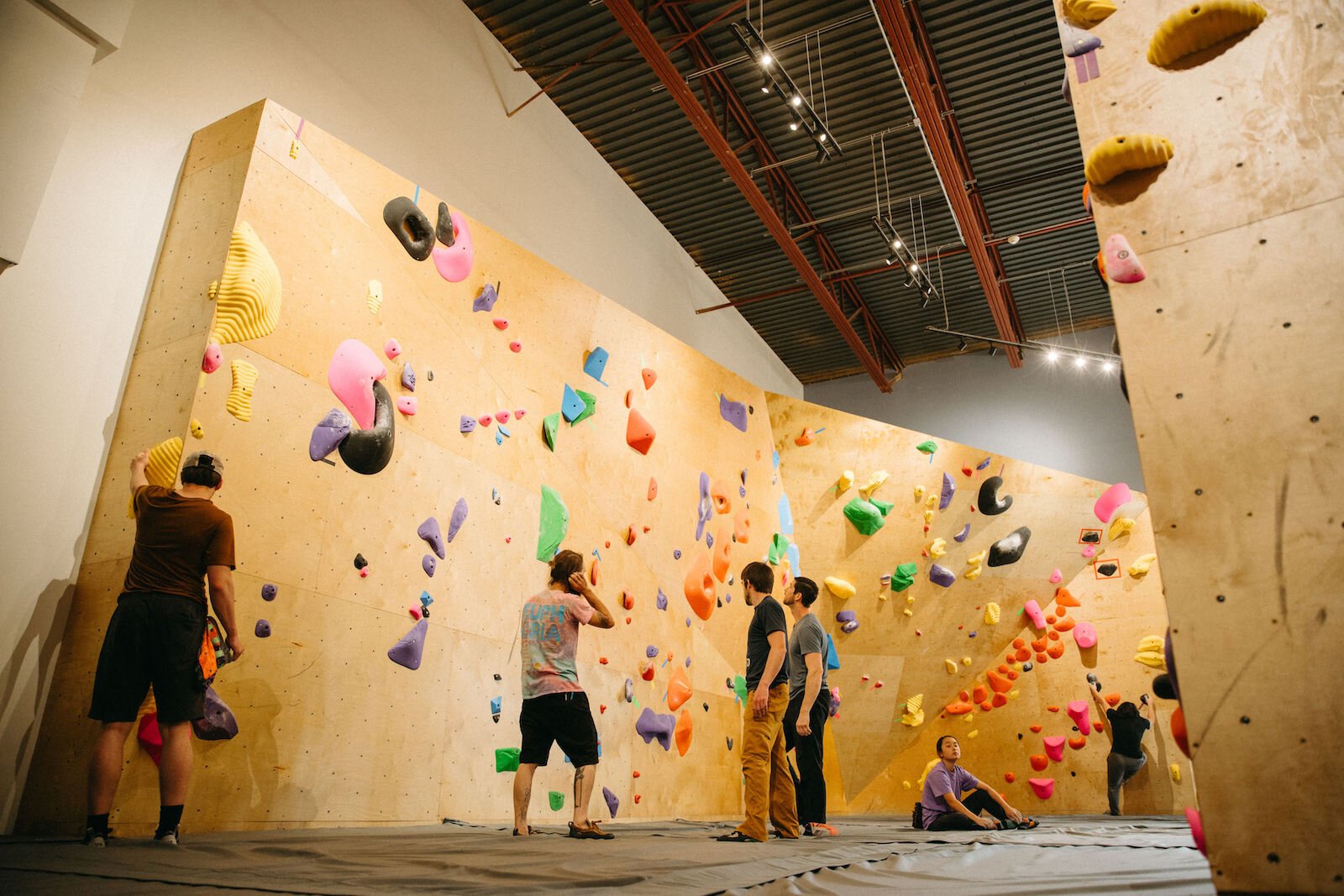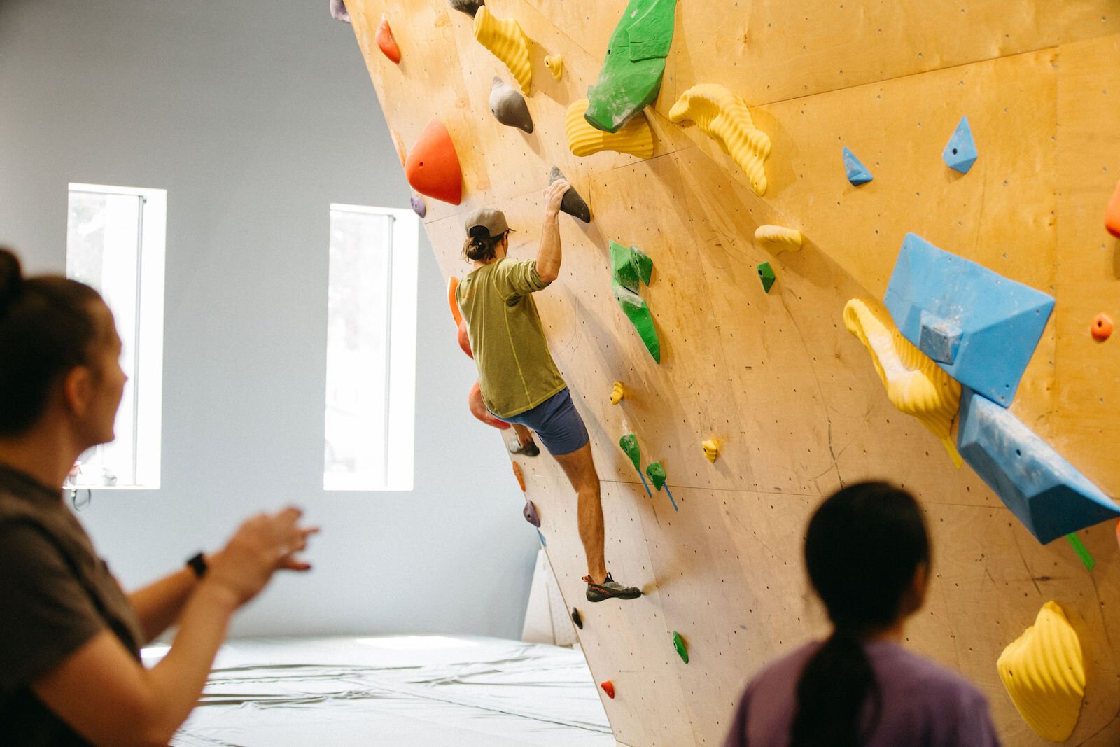 Founding members attempt routes at the soft opening of Summit City Climbing Co.