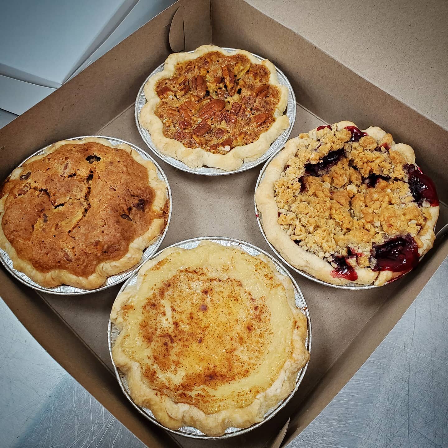 So far she says both arrangements seem to be working out. Customers are buying pies for a variety of occasions and keeping her busy with requests for treats for grandparents, birthday celebrations, and even office parties via Zoom. Harrison serves full-sized pies, as well as mini ones, all packed with sweet or savory flavors.