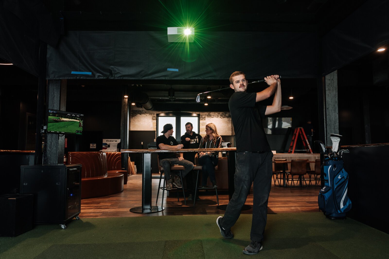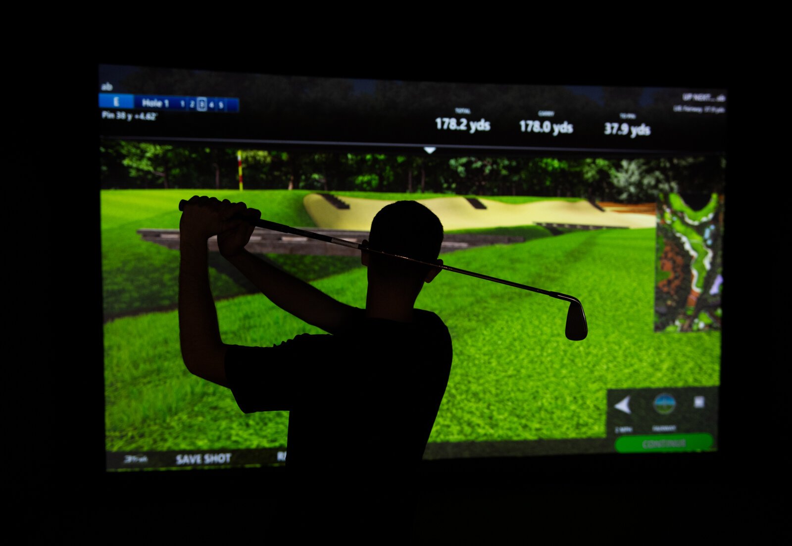 Assistant Pro Wyatt Johnson tests out a golf simulation bay at Urban Golf on the second floor at The Fairfield.