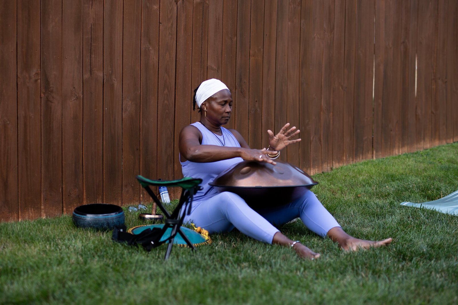 “I’m going to play my handpan drum for you now, so you can remove this energy you’ve felt all day and make room for wellness,” Rogers says, tapping out a soothing rhythm after she talks.