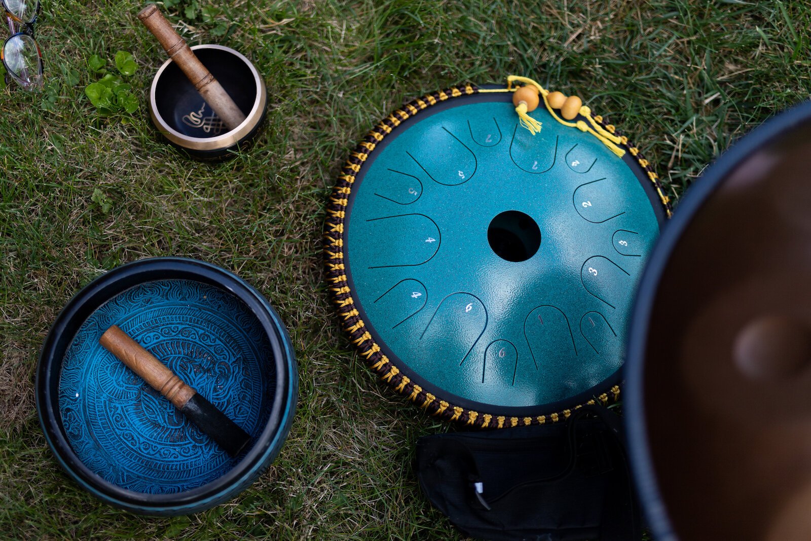 She also uses a tongue drum and various singing bowls during the class.
