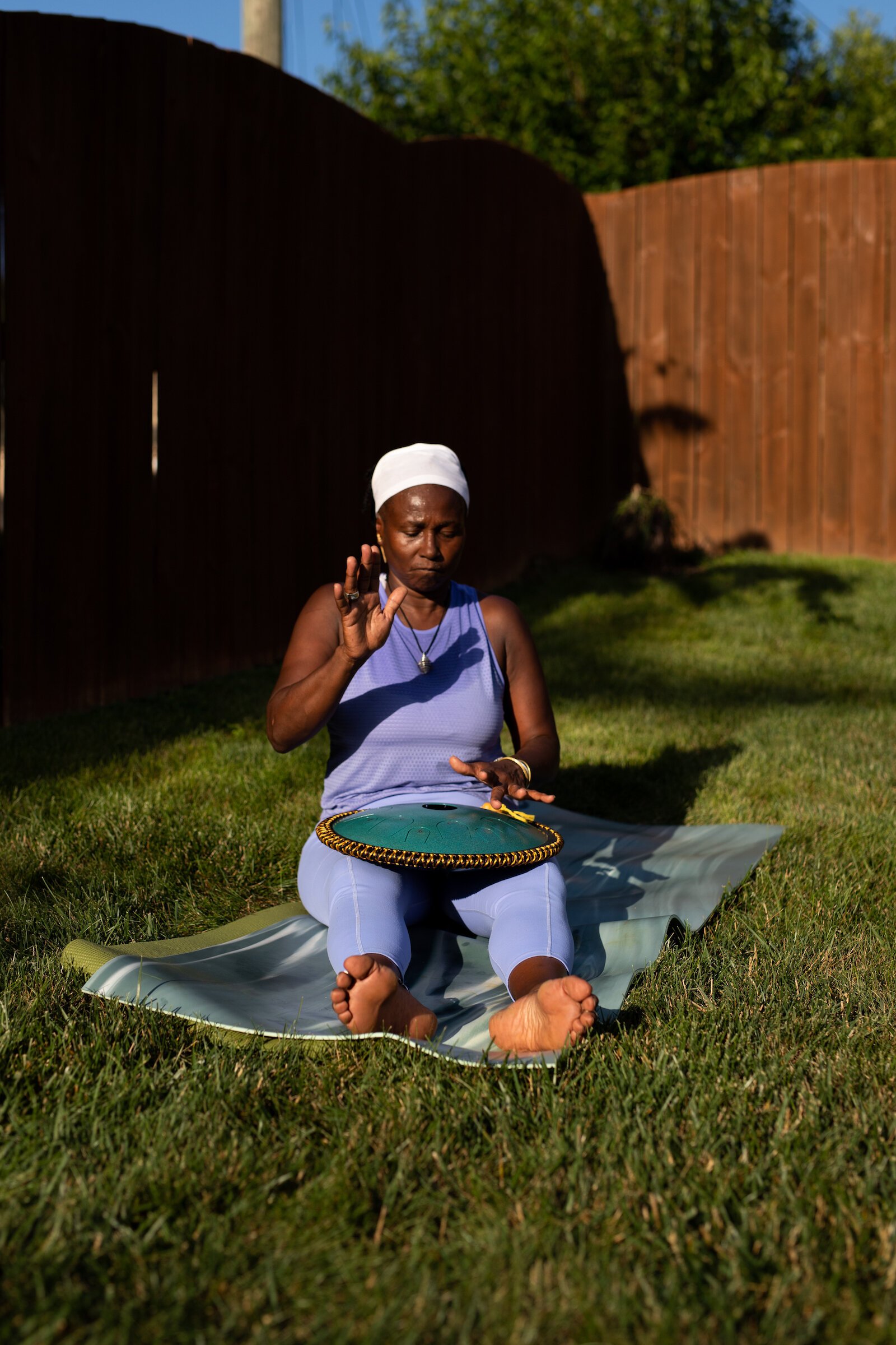 Evans says one thing that sets Rooted Connection yoga apart from other classes she’s experienced is how Diane blends her yogi training with her drumming expertise. When the class begins and ends, she ushers participants into and out of the experience with her melodic 432 frequency handpan, or hang, drum.