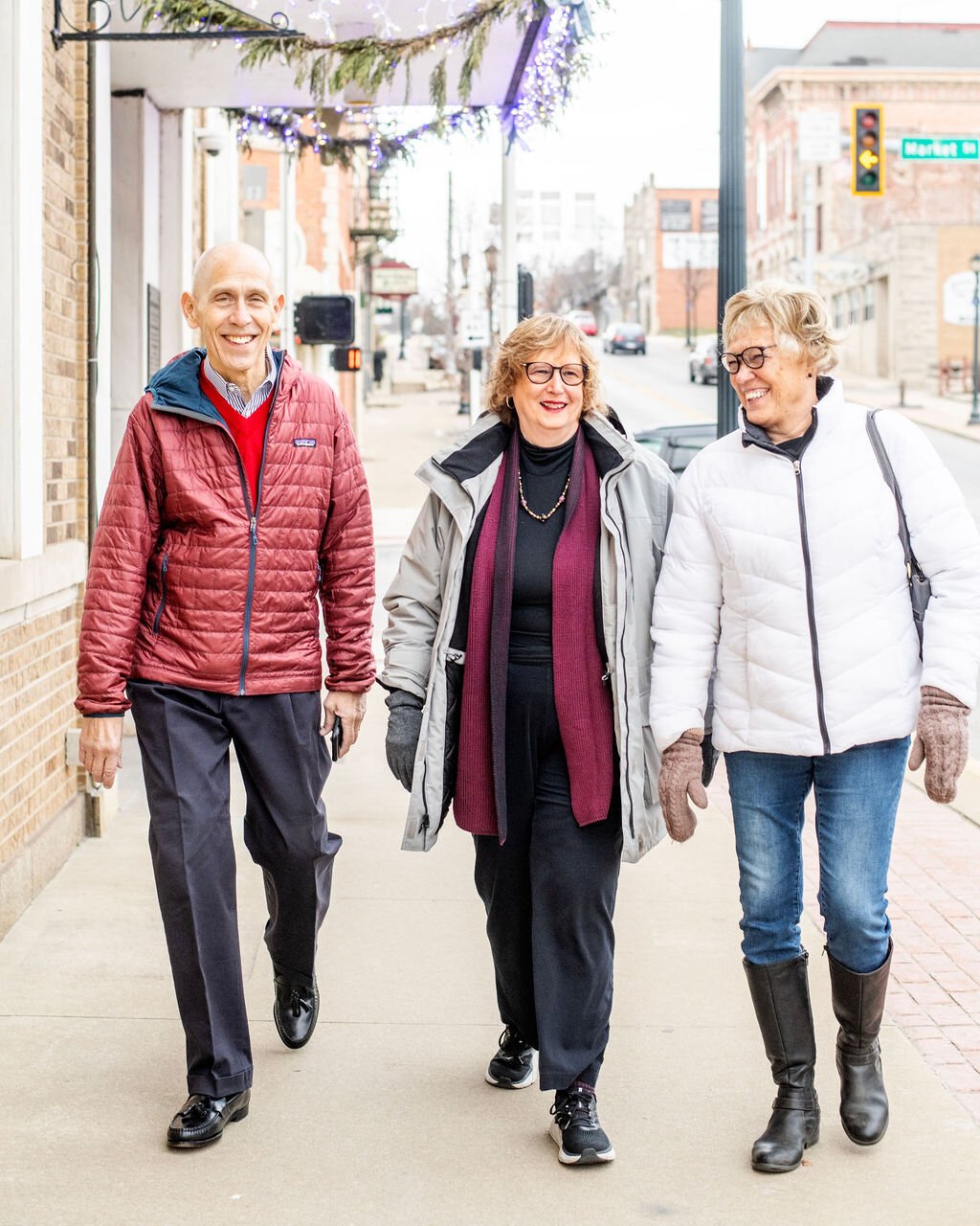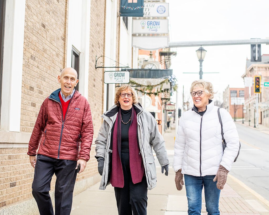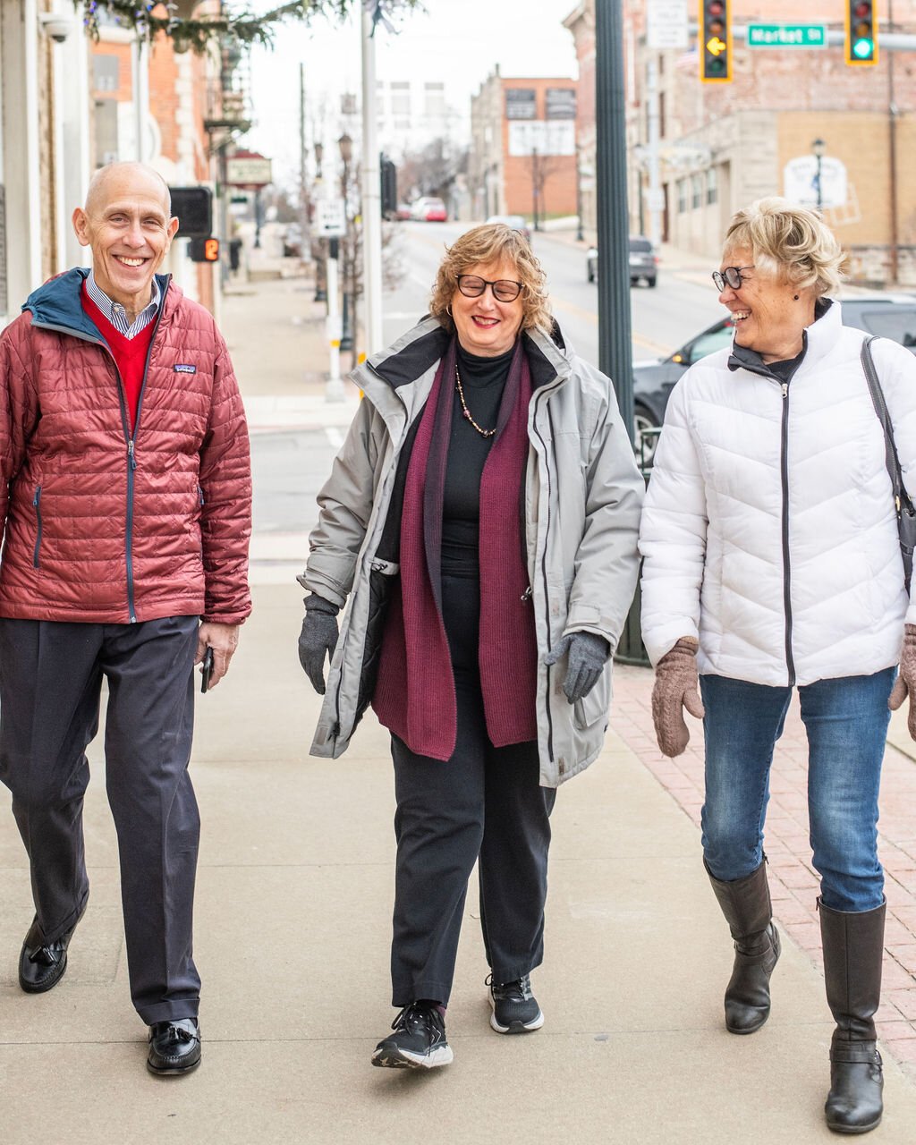Retirees (left to right) Dave Haist, Jan Roland, and Beverly Vanderpool walk through Downtown Wabash.