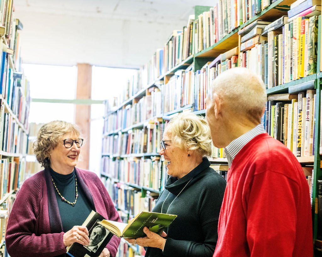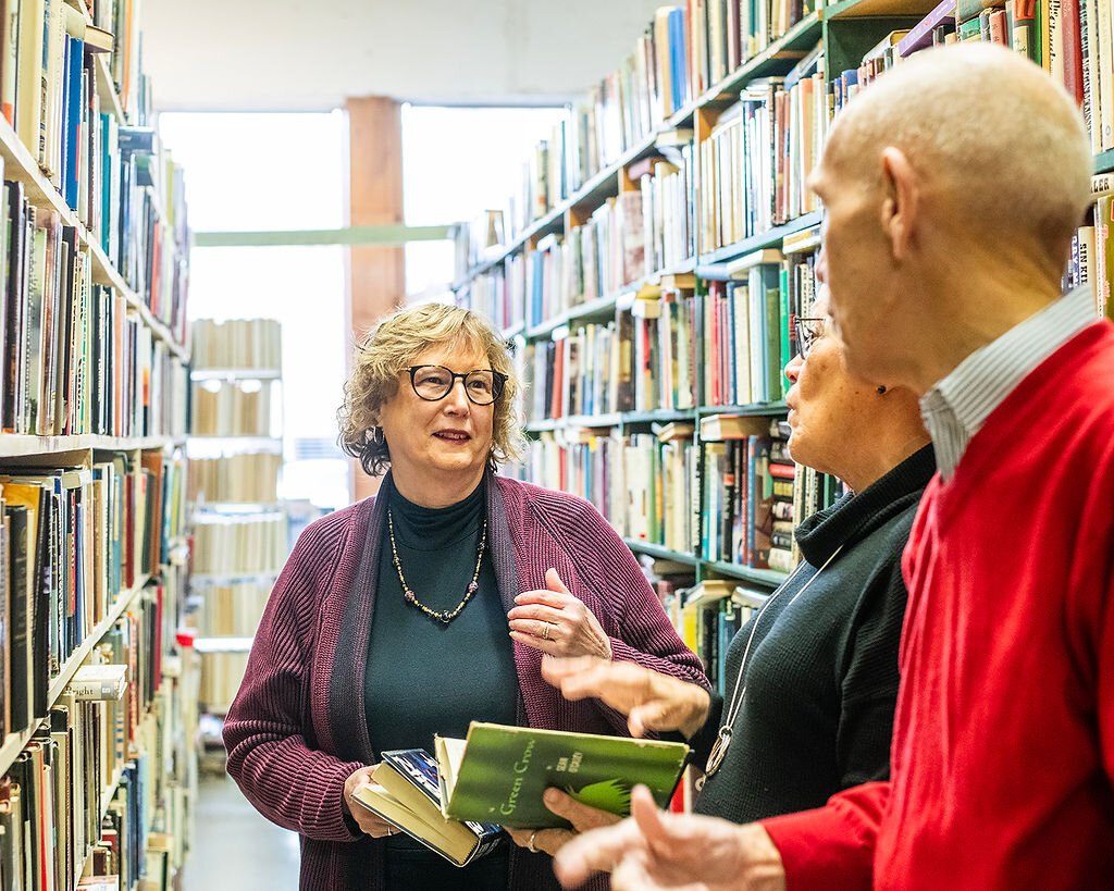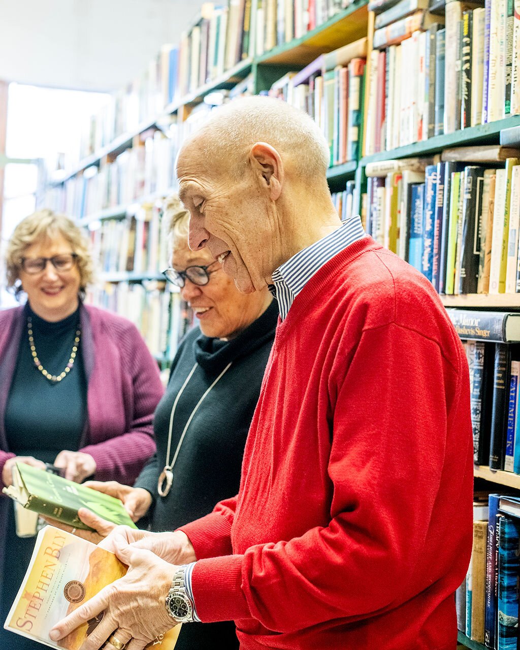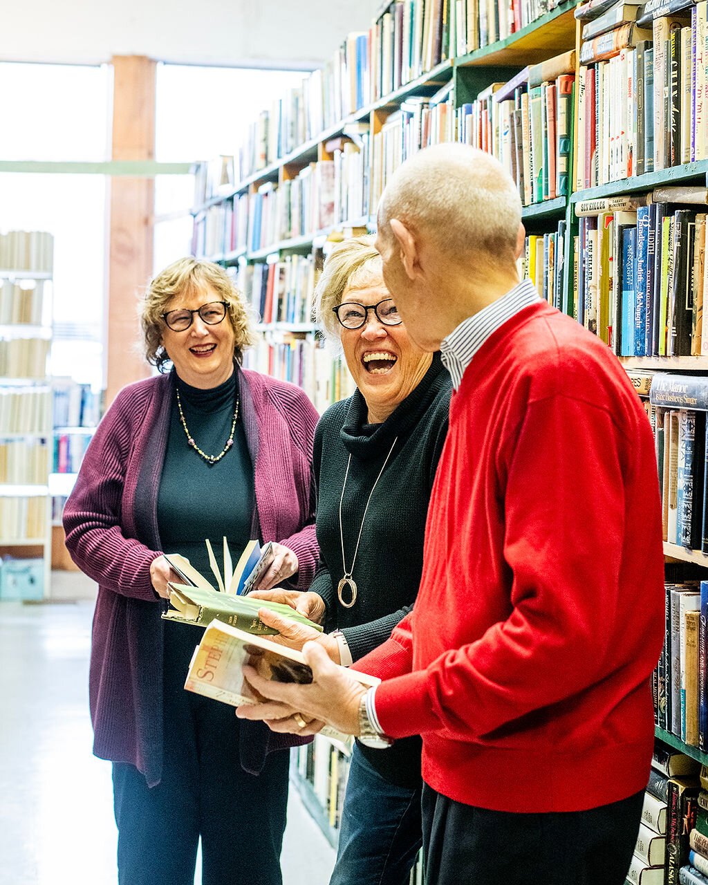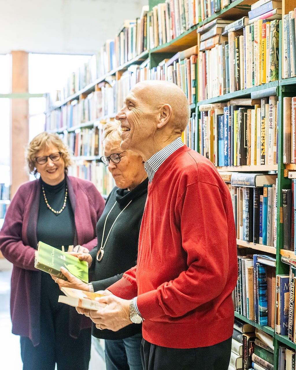 Retirees (left to right) Jan Roland, Beverly Vanderpool, and Dave Haist browse books at Reading Room Books in Wabash.