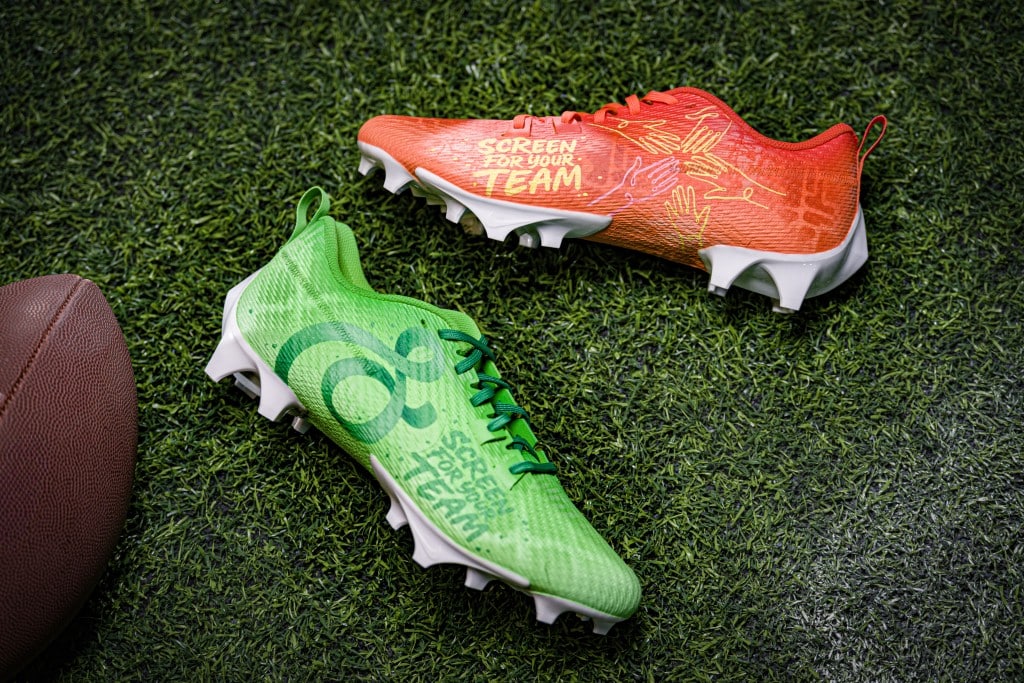 The cleats were created as an extension of Parkview’s “Show Up for Them” campaign, incorporating Parkview’s colors and diamond pattern along with the “Screen for Your Team” theme. One cleat features a series of hands representing the people who support you — with a pink hand paying tribute to Pierce’s mother and her breast cancer journey. The other includes an “S”-shaped cancer ribbon, designed in her honor, reinforcing the idea that getting screened is a way to show up for those who matter most.