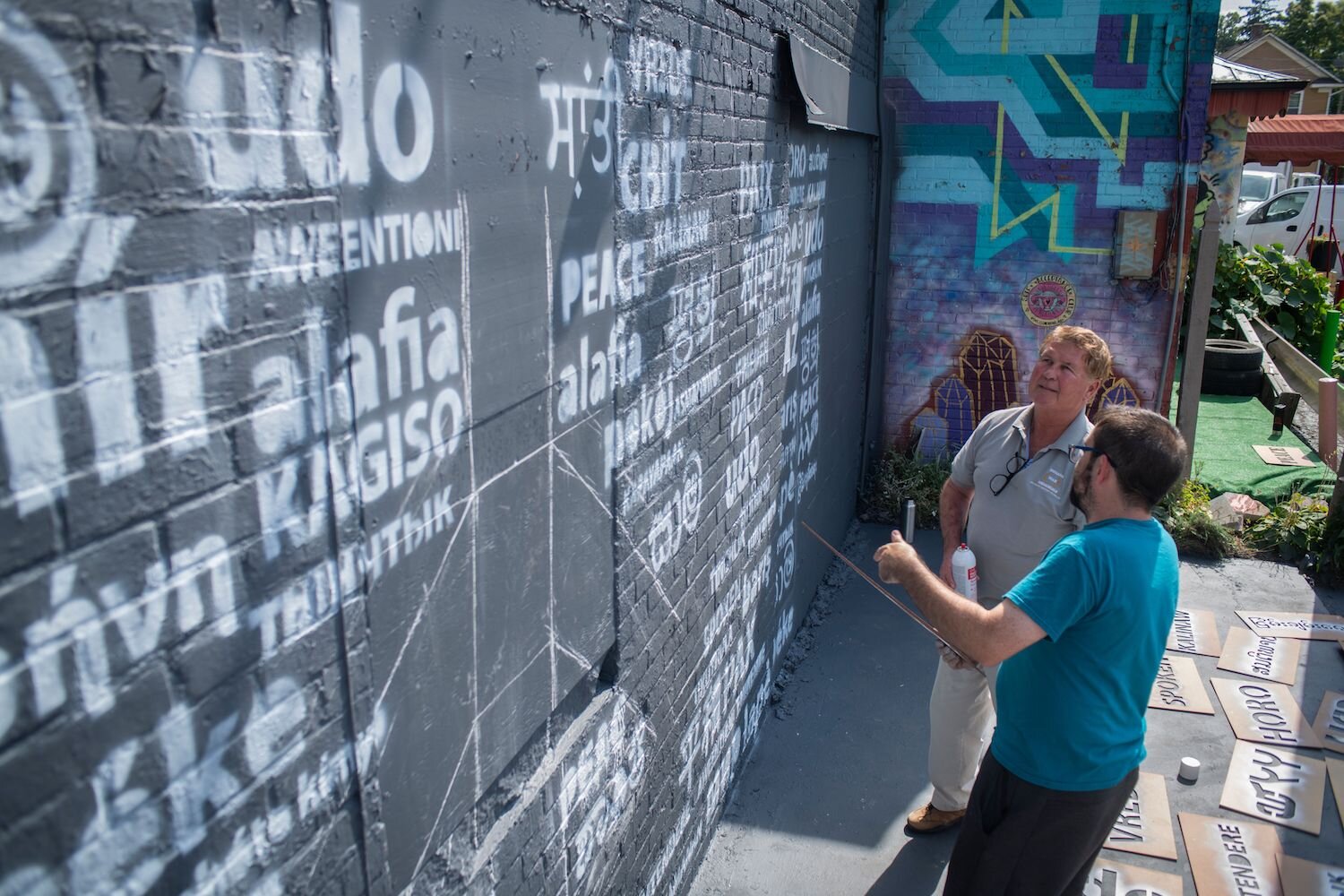 On an 80-degree Saturday afternoon in September, Swartz, Roembke, and a crew of Wunderkammer volunteersĀ are spray painting the Peace Mural with stencils. Throughout the week, community members have been invited to stop by and spray a word or two themselves.