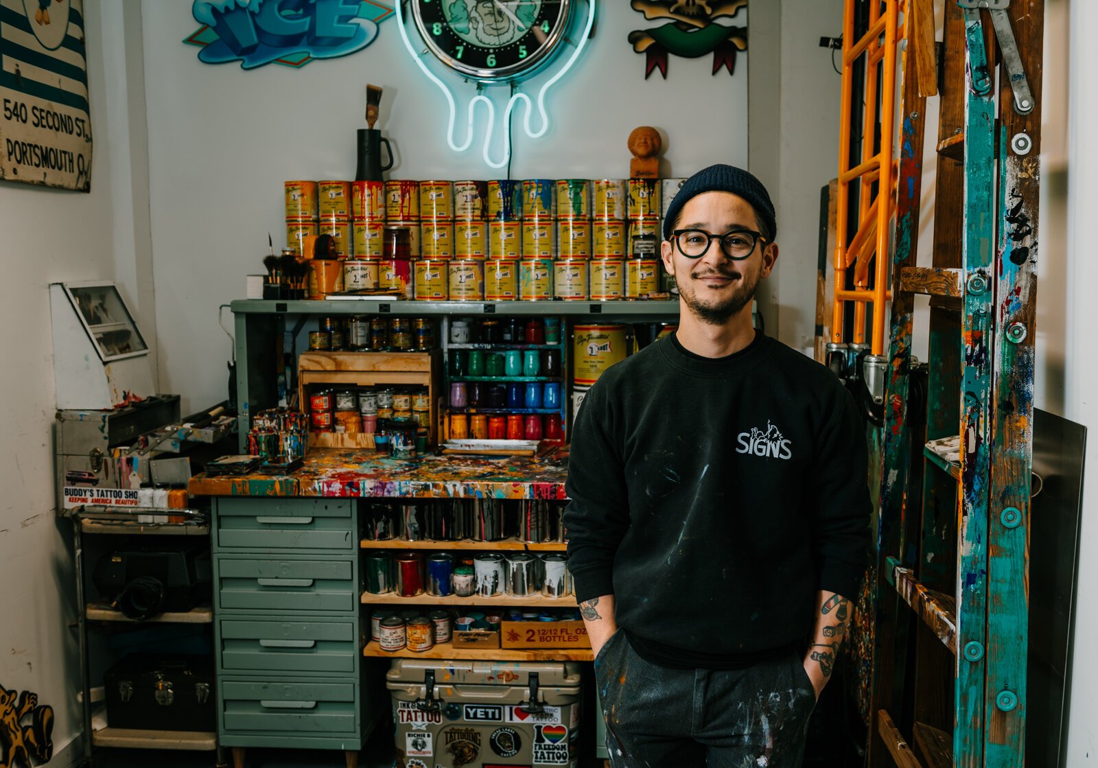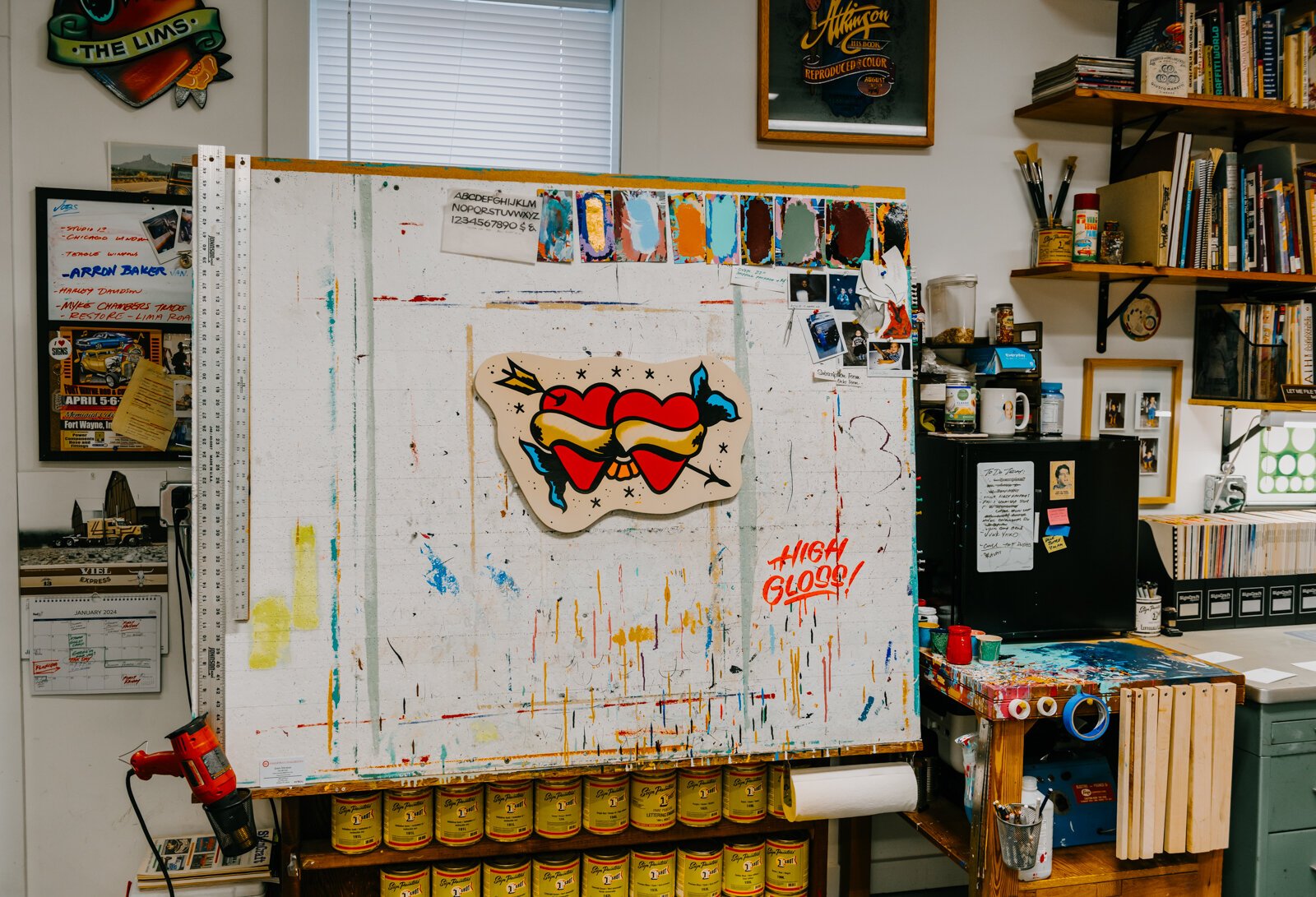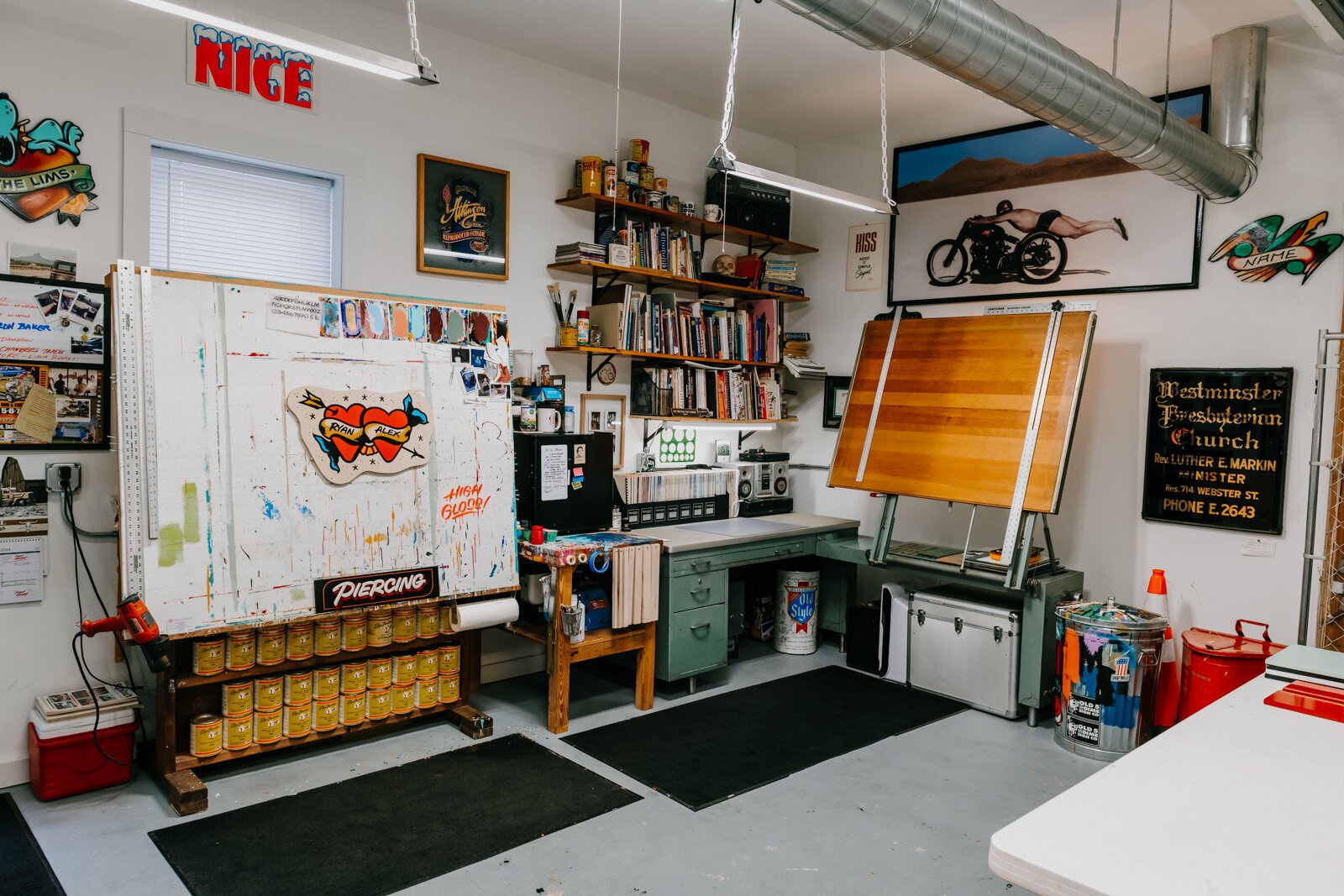 Then he moved and was able to use a woodworking shop built by a previous owner on the back of his property, customizing the interior to fulfill his sign-making needs. Lim used that space as his shop for over a decade, then when he sold that house, he lost his workspace. He moved his company into the shop on Fairfield, a space that he’s had for the last year and a half. Even though he has a physical studio, Lim’s unique profession allows him to travel creating hand-painted signs and windows across the country.