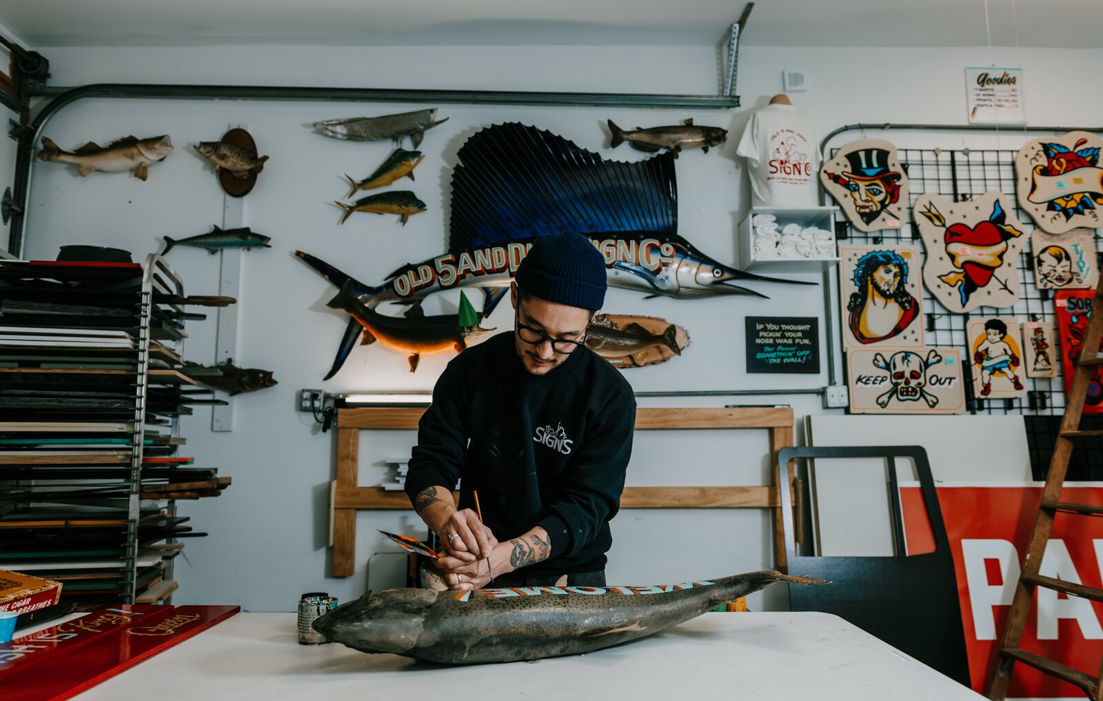 He owns Old 5 and Dime Sign Co. and his work can also be seen across town at various businesses such as Tolon, Big Apple Pizza, Freedom Tattoo, Fancy & Staple, Hopscotch House, and Studio 13– just to name a few. Local companies appreciate his traditional and old-school approach.