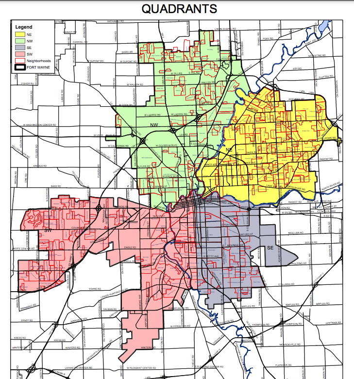 In 1995, as part of an effort to eliminate communication barriers, streamline the dissemination of information, and provide centralized meetings for neighborhood residents, the City of Fort Wayne established four Area Partnerships or quadrants: Northeast, Northwest, South East, and Southwest.