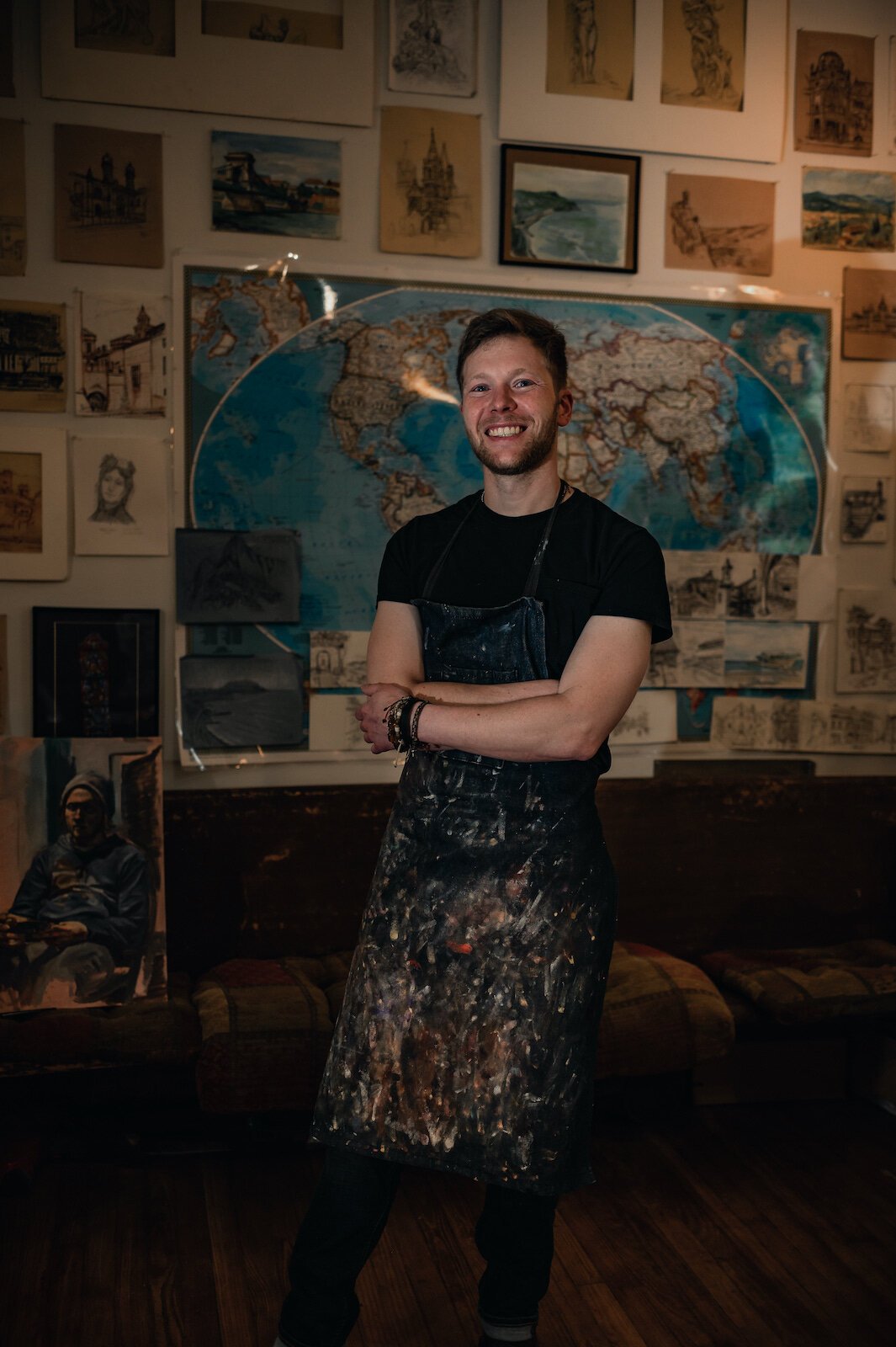 Peter— who’s known for his narrative paintings — works out of a loft apartment that flanks his father’s workshop. But it wasn’t that long ago that the block was quiet and even blighted in his estimation. About a dozen years ago, he and his father saw an opportunity to not only expand the family business but also revive an area that was once a hotspot of activity